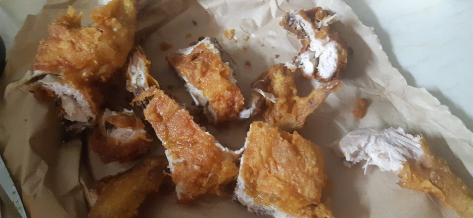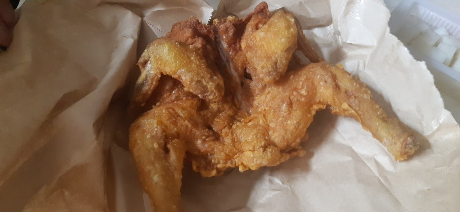 집에 도착해 봉투를 열자마자 고소한 튀김 냄새가 온 집안에 퍼졌습니다. 따끈한 통닭 한 마리가 종이 포장지에 싸여 있었는데, 튀김옷만 봐도 얼마나 바삭할지 짐작이 갑니다.